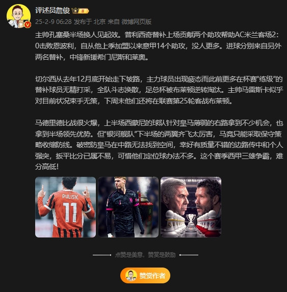 直播吧2月9日讯凌晨五大联赛,意甲AC米兰2-0恩波利、皇马1-1马竞、布莱顿2-1切尔西,闻名褒贬员詹俊在微博对几场比赛作念出点评。